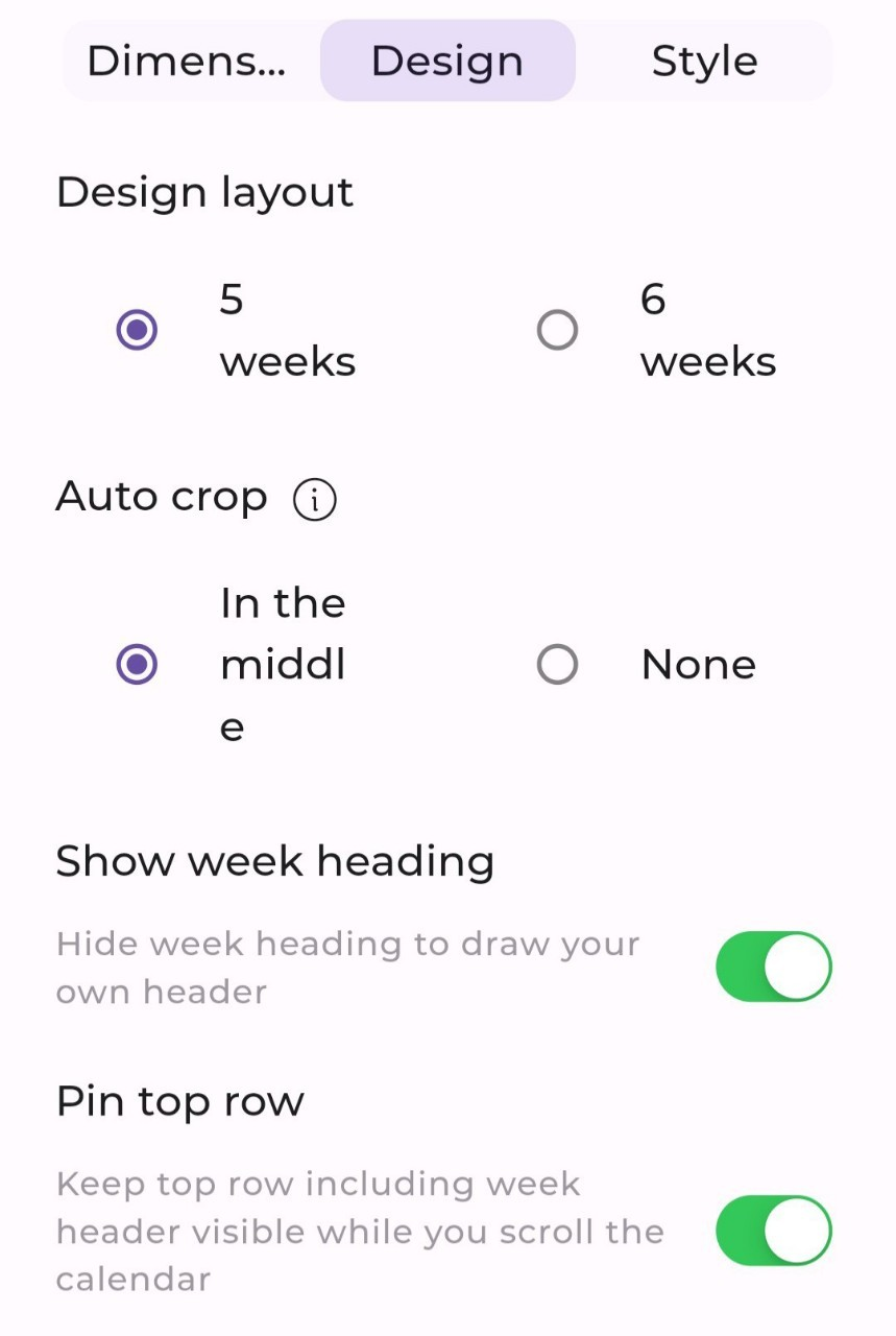 In this section you can choose a Design layout to display the monthly calendar in 5 or 6 weeks. Select Auto crop in the middle so your design can fit into any month’s layout. Besides, you have switch options such as Show week heading, Pin to row, Calendar on top and Notes on top.