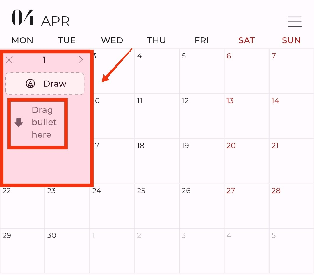 Tap the plus (+) button at the bottom right corner of the screen and select the moon face icon. A list of moods and weather icons will appear horizontally at the bottom of the screen. Press and hold any mood you want, then drag it into the selected day’s box. You can even create a new mood using this tip!