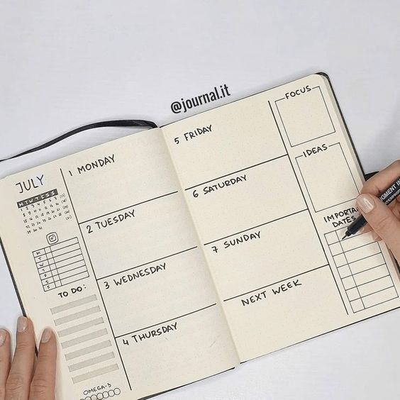 Weekly Log: This is a page or spread dedicated to planning your week. It typically includes a section for each day of the week, where you can write down your tasks, events, and appointments.